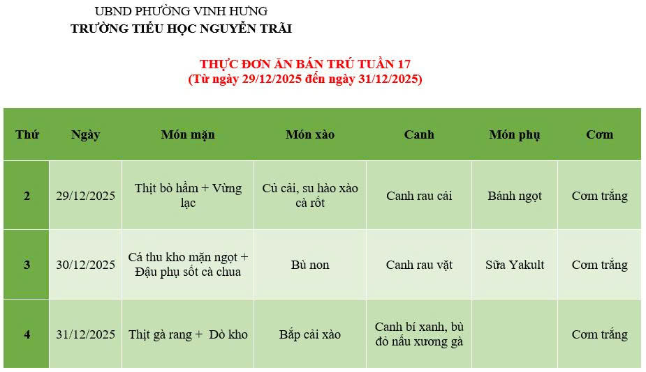 THỰC ĐƠN ĂN BÁN TRÚ TUẦN 17 (Từ ngày 29/12/2025 đến ngày 31/12/2025)