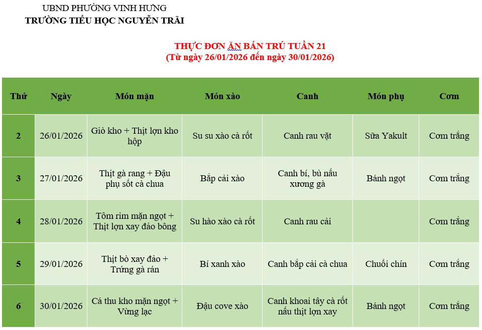 THỰC ĐƠN ĂN BÁN TRÚ TUẦN 21 (Từ ngày 26/01/2026 đến ngày 30/01/2026)