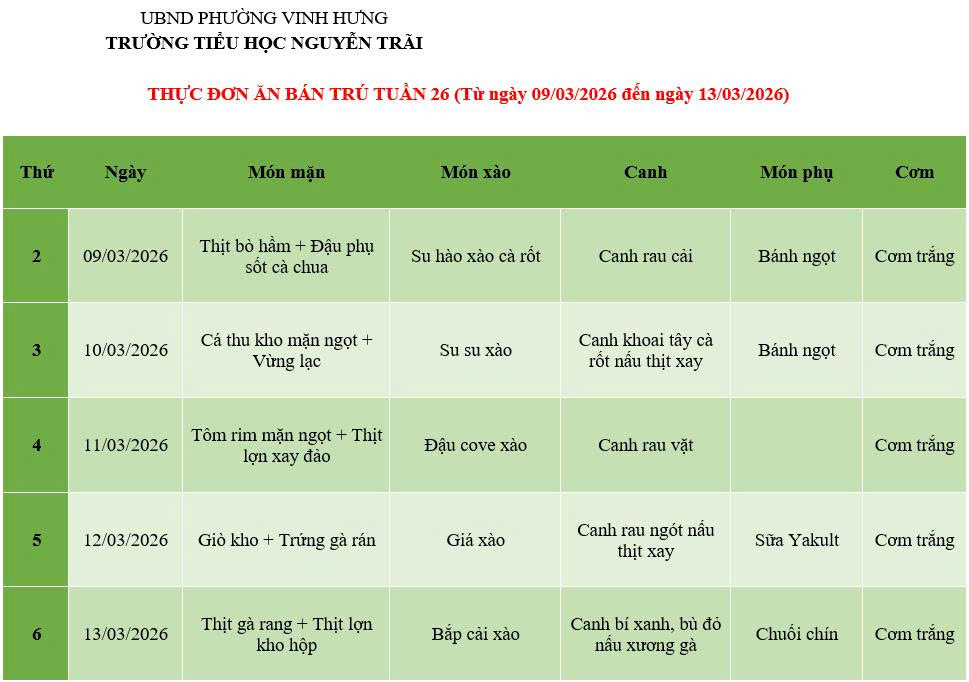 THỰC ĐƠN ĂN BÁN TRÚ TUẦN 26 (Từ ngày 09/03/2026 đến ngày 13/03/2026)