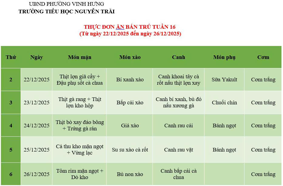 THỰC ĐƠN ĂN BÁN TRÚ TUẦN 16 (Từ ngày 22/12/2025 đến ngày 26/12/2025)