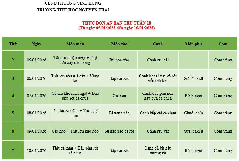 THỰC ĐƠN ĂN BÁN TRÚ TUẦN 18 (Từ ngày 05/01/2026 đến ngày 10/01/2026)