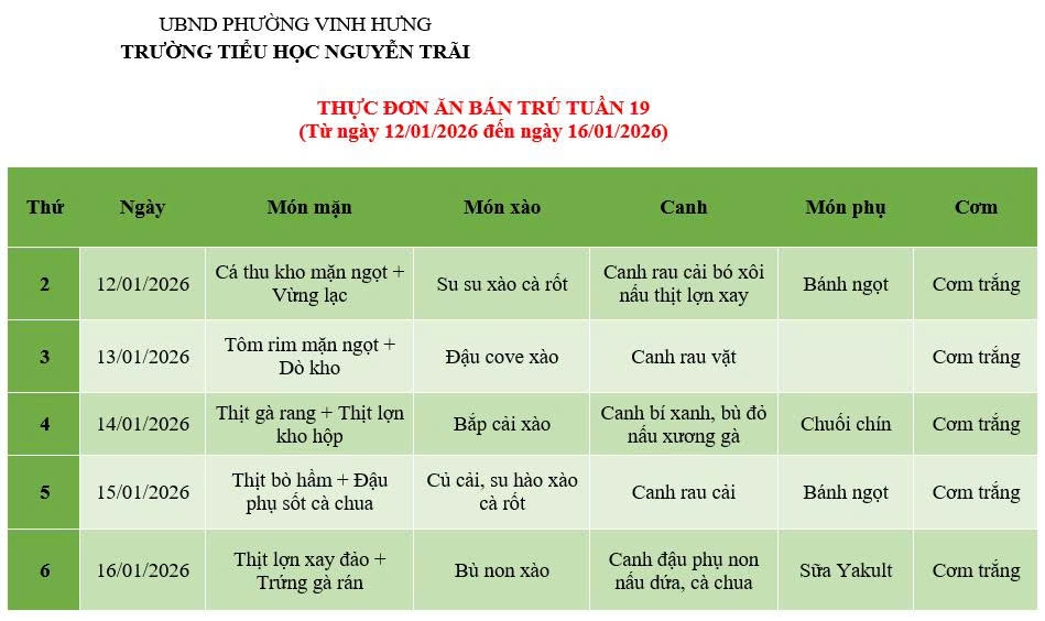 THỰC ĐƠN ĂN BÁN TRÚ TUẦN 19 (Từ ngày 12/01/2026 đến ngày 16/01/2026)