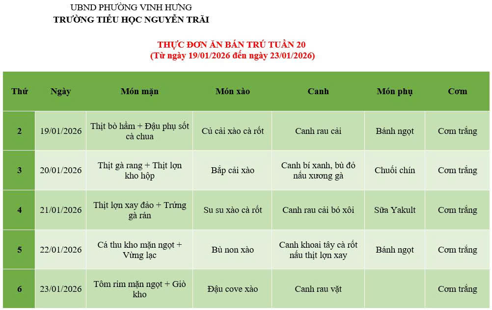 THỰC ĐƠN ĂN BÁN TRÚ TUẦN 20 (Từ ngày 19/01/2026 đến ngày 23/01/2026)