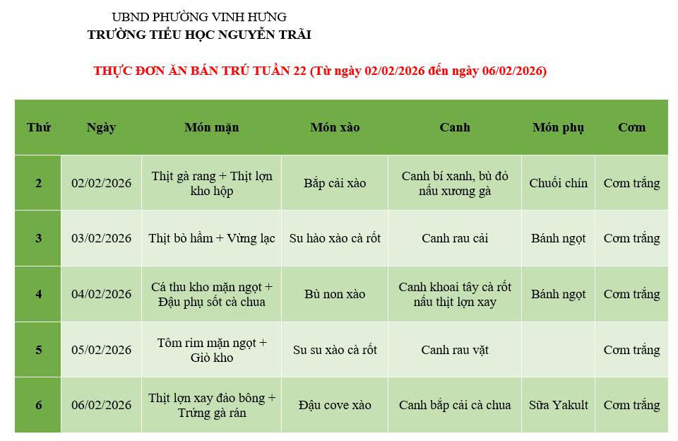 THỰC ĐƠN ĂN BÁN TRÚ TUẦN 22 (Từ ngày 02/02/2026 đến ngày 06/02/2026)