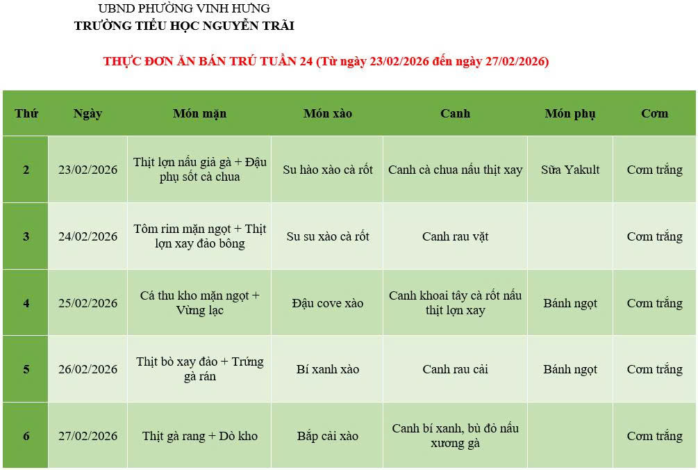 THỰC ĐƠN ĂN BÁN TRÚ TUẦN 24 (Từ ngày 23/02/2026 đến ngày 27/02/2026)