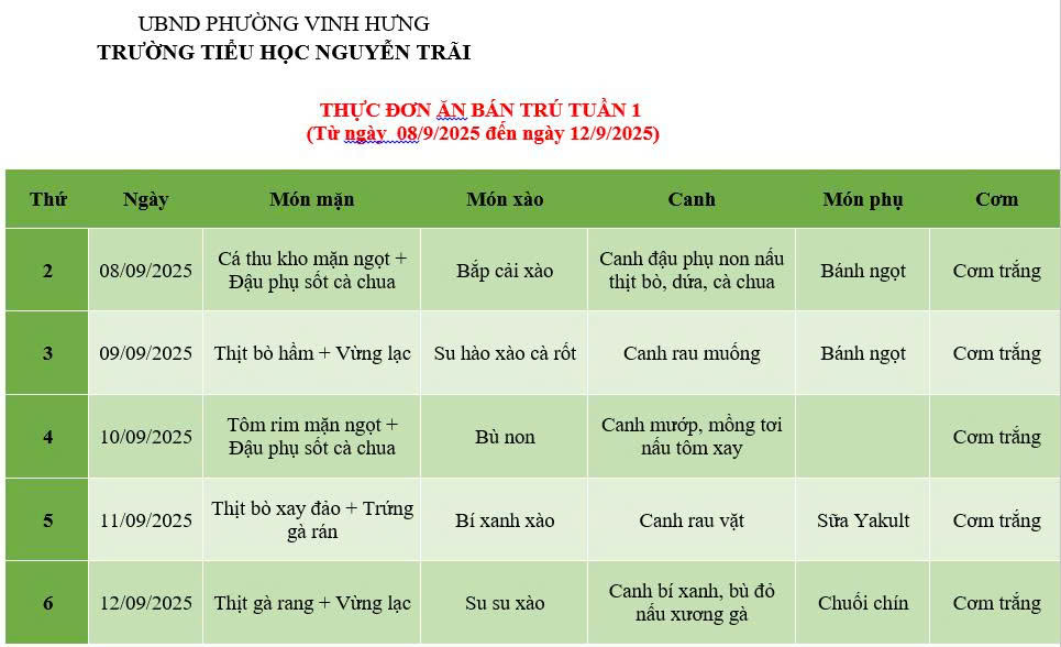 THỰC ĐƠN ĂN BÁN TRÚ TUẦN 1 (Từ ngày 08/9/2025 đến ngày 12/9/2025)