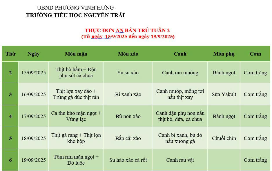 THỰC ĐƠN ĂN BÁN TRÚ TUẦN 2 (Từ ngày 15/9/2025 đến ngày 19/9/2025)