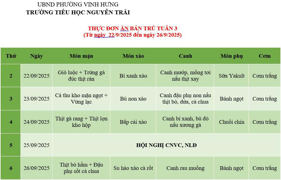 THỰC ĐƠN ĂN BÁN TRÚ TUẦN 3 (Từ ngày 22/9/2025 đến ngày 26/9/2025)