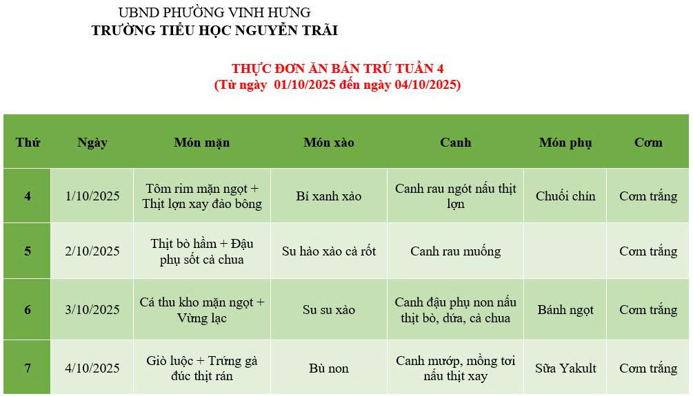 THỰC ĐƠN ĂN BÁN TRÚ TUẦN 4 (Từ ngày 01/10/2025 đến ngày 04/10/2025)