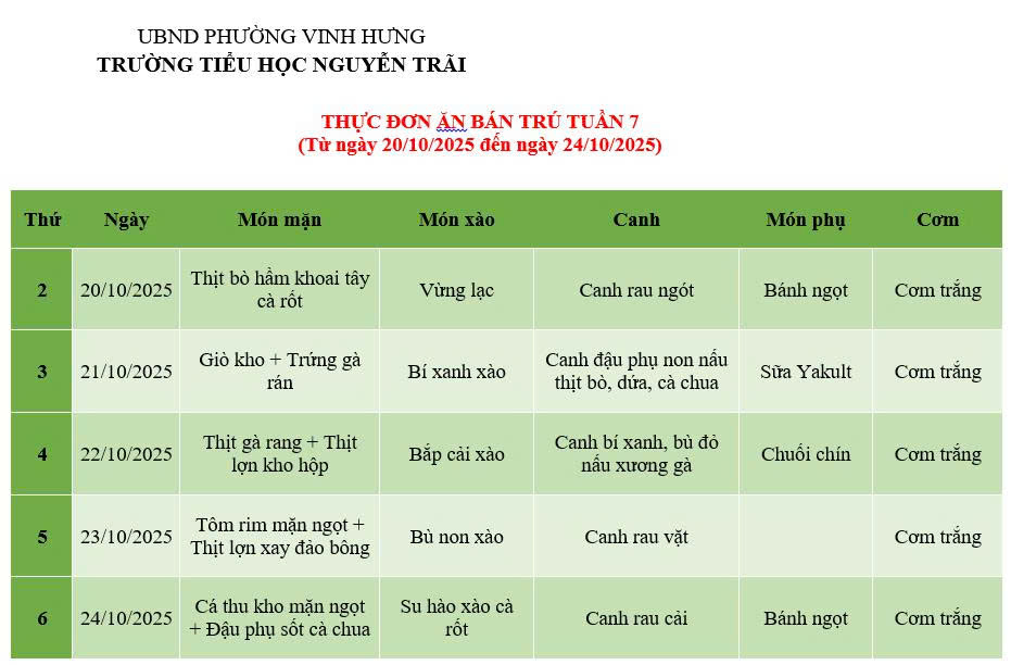 THỰC ĐƠN ĂN BÁN TRÚ TUẦN 7 (Từ ngày 20/10/2025 đến ngày 24/10/2025)