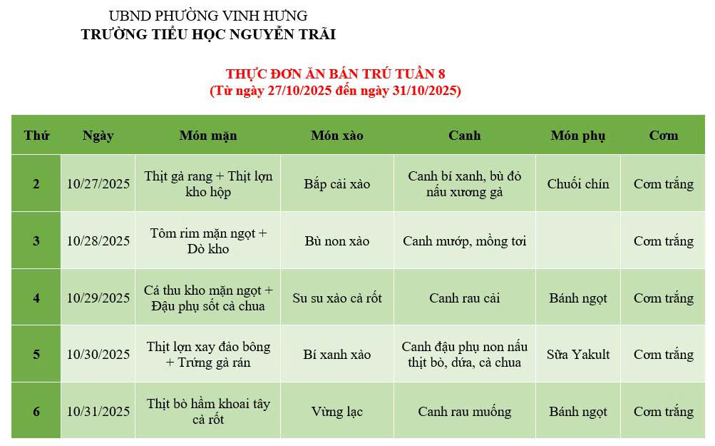 THỰC ĐƠN ĂN BÁN TRÚ TUẦN 8 (Từ ngày 27/10/2025 đến ngày 31/10/2025)