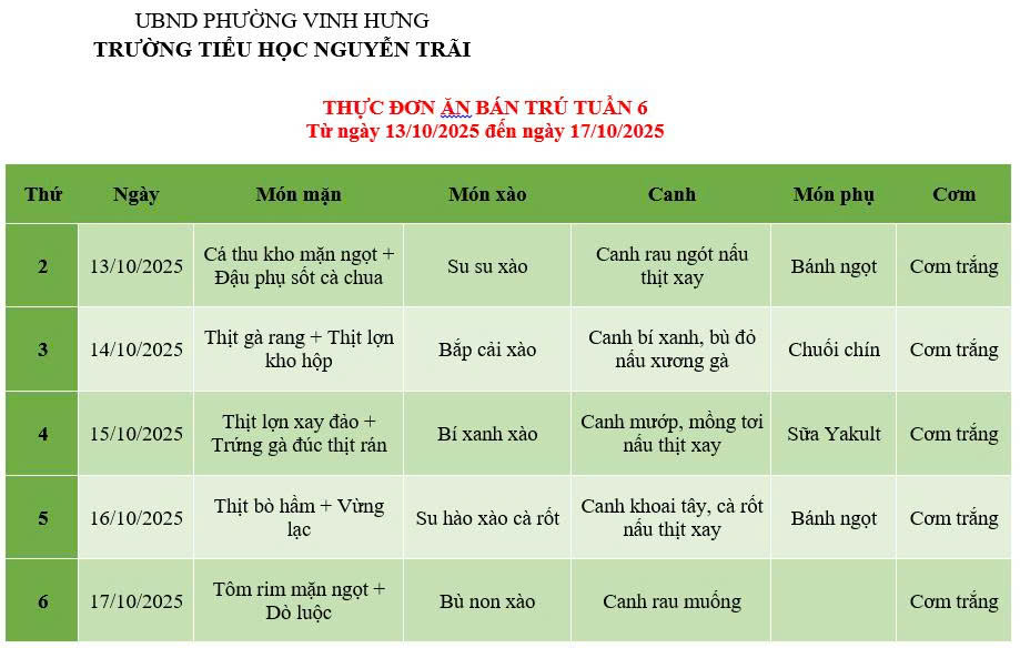 THỰC ĐƠN ĂN BÁN TRÚ TUẦN 6 (Từ ngày 13/10/2025 đến ngày 17/10/2025)