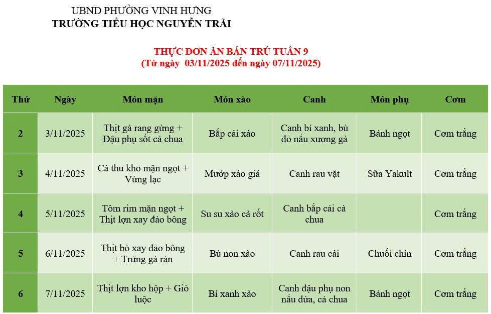 THỰC ĐƠN ĂN BÁN TRÚ TUẦN 9 (Từ ngày 03/11/2025 đến ngày 07/11/2025)