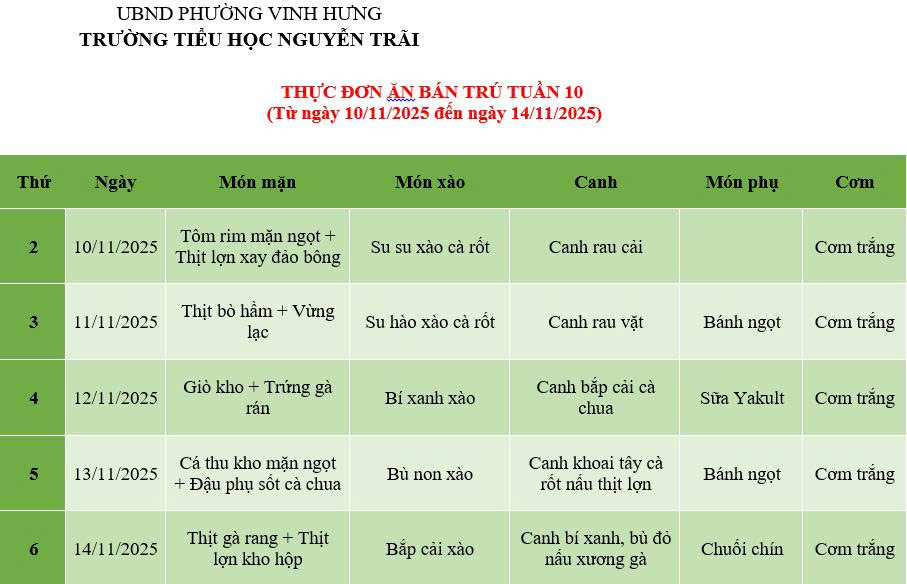 THỰC ĐƠN ĂN BÁN TRÚ TUẦN 10 (Từ ngày 10/11/2025 đến ngày 14/11/2025)