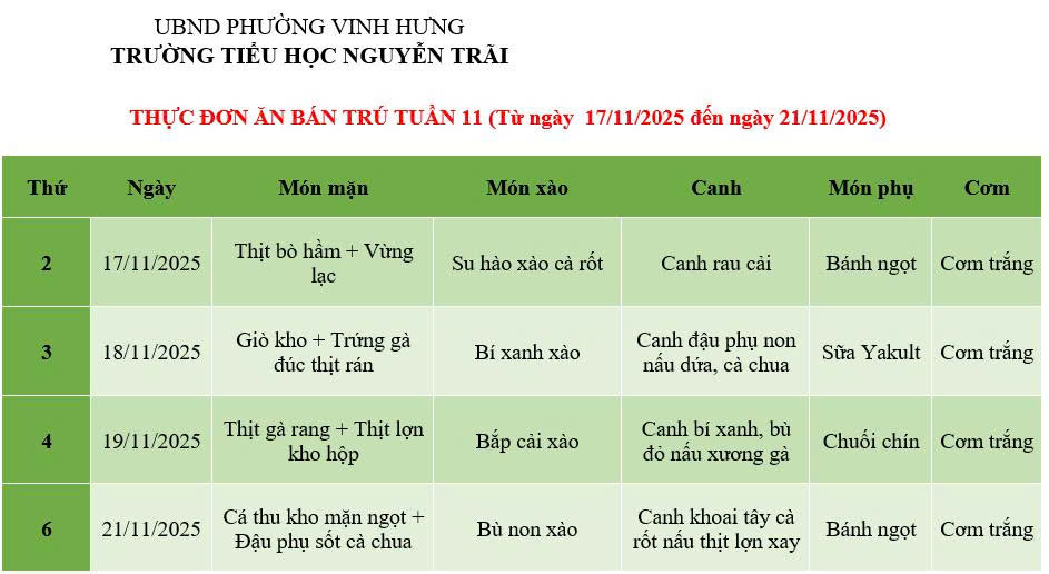 THỰC ĐƠN ĂN BÁN TRÚ TUẦN 11 (Từ ngày 17/11/2025 đến ngày 21/11/2025)