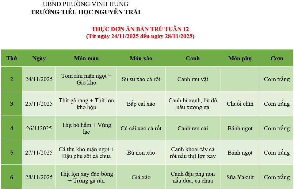 Thực đơn bán trú tuần 12 - Năm học 2025-2026