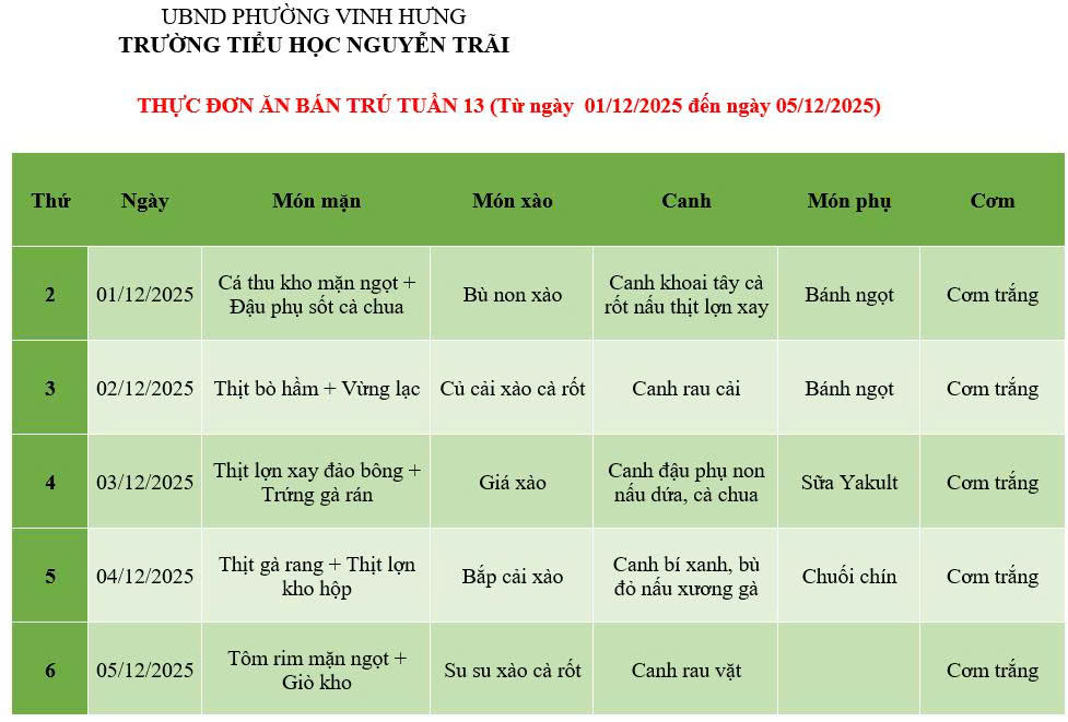 THỰC ĐƠN ĂN BÁN TRÚ TUẦN 13 (Từ ngày 01/12/2025 đến ngày 05/12/2025)