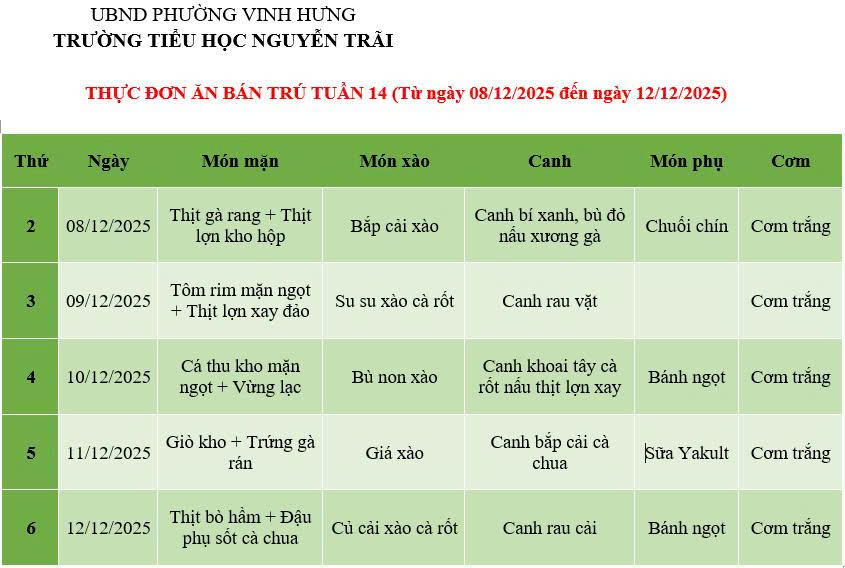 THỰC ĐƠN ĂN BÁN TRÚ TUẦN 14 (Từ ngày 08/12/2025 đến ngày 12/12/2025)