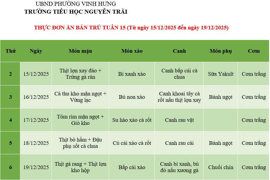 THỰC ĐƠN ĂN BÁN TRÚ TUẦN 15 (Từ ngày 15/12/2025 đến ngày 19/12/2025)