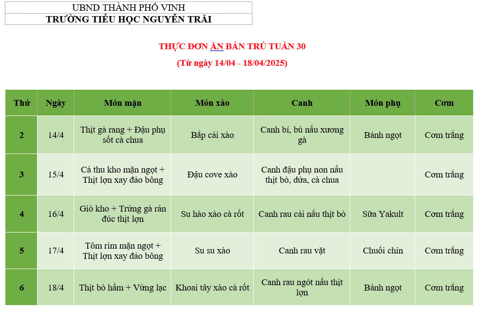 THỰC ĐƠN ĂN BÁN TRÚ TUẦN 30 (Từ ngày 14/04 - 18/04/2025)