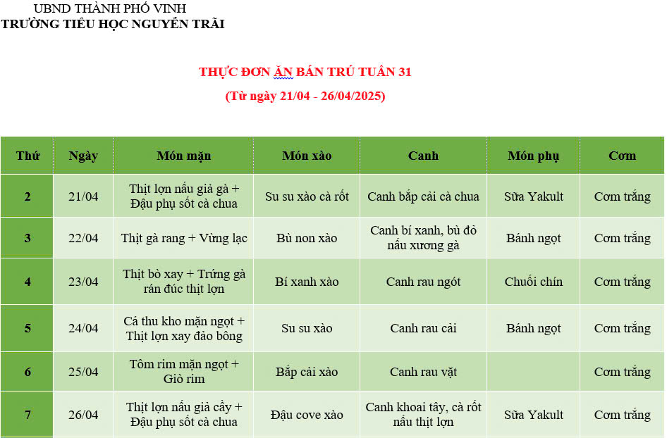 THỰC ĐƠN ĂN BÁN TRÚ TUẦN 31 (Từ ngày 21/4/2025 đến ngày 26/4/2025)