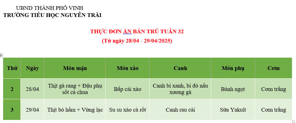 THỰC ĐƠN ĂN BÁN TRÚ TUẦN 2 (Từ ngày 28/4/2025 đến ngày 29/4/2025)