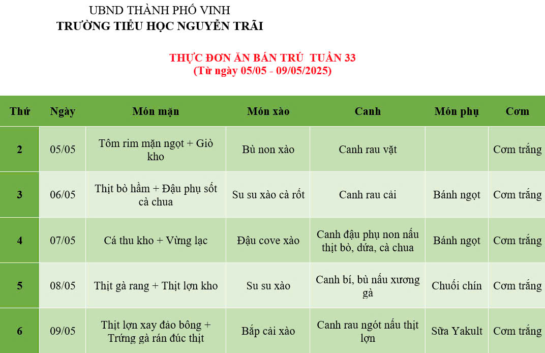 THỰC ĐƠN ĂN BÁN TRÚ TUẦN 33 (Từ ngày 05/05/2025 đến ngày 09/05/2025)